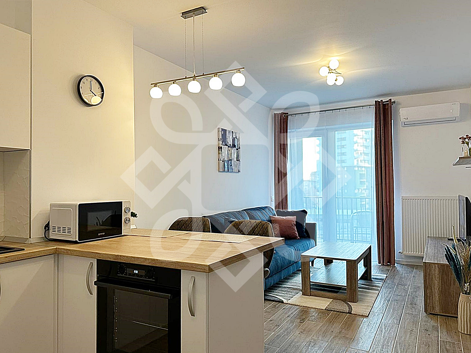 Locuinta este amenajata modern, dotata cu ferestre cu geam termopan, usi de interior MDF, usa de inalta siguranta, mobilier facut la comanda si electrocasnice calitative. Dotari: aer conditionat, videointerfon, combina frigorifica, plita electrica, cuptor electric, cuptor cu microunde, masina de spalat rufe.