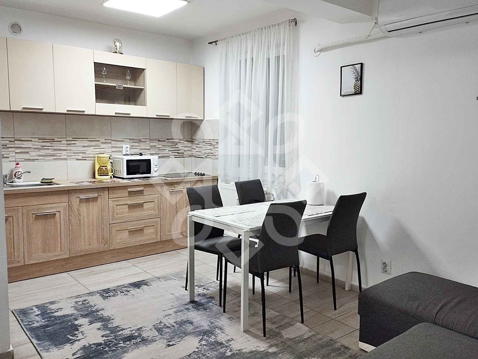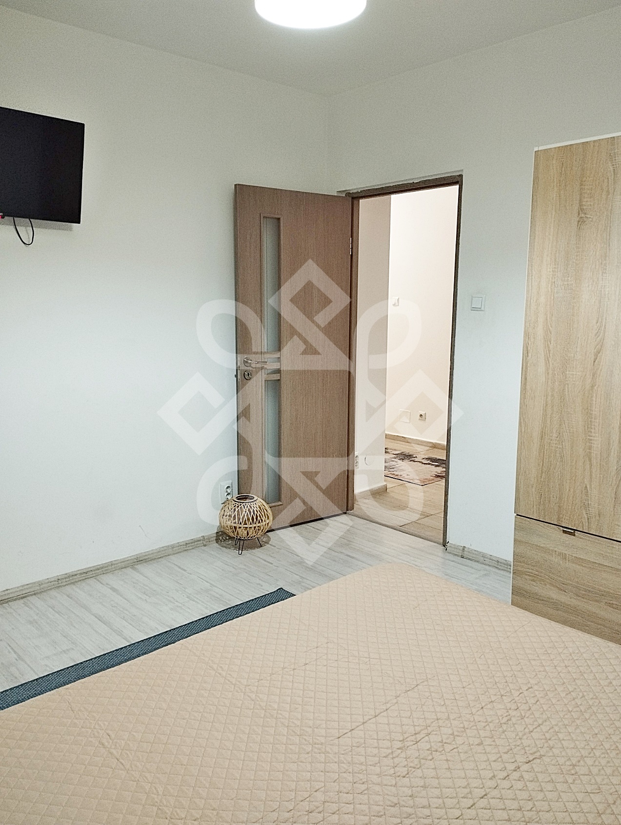 Se inchiriaza mobilat si utilat cu masina de spalat rufe, frigider, plita electrica, cuptor cu microunde, aer conditionat.
